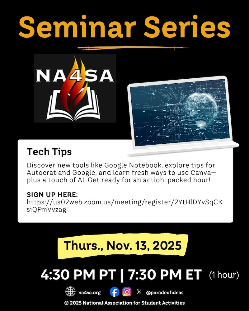 Throughout the school year from September to May, our virtual NA4SA Seminar Series explores an area or topic of interest to Student Activity Professionals. There is NO COST to participate in our Seminar Series and you can attend one seminar or come to them all!